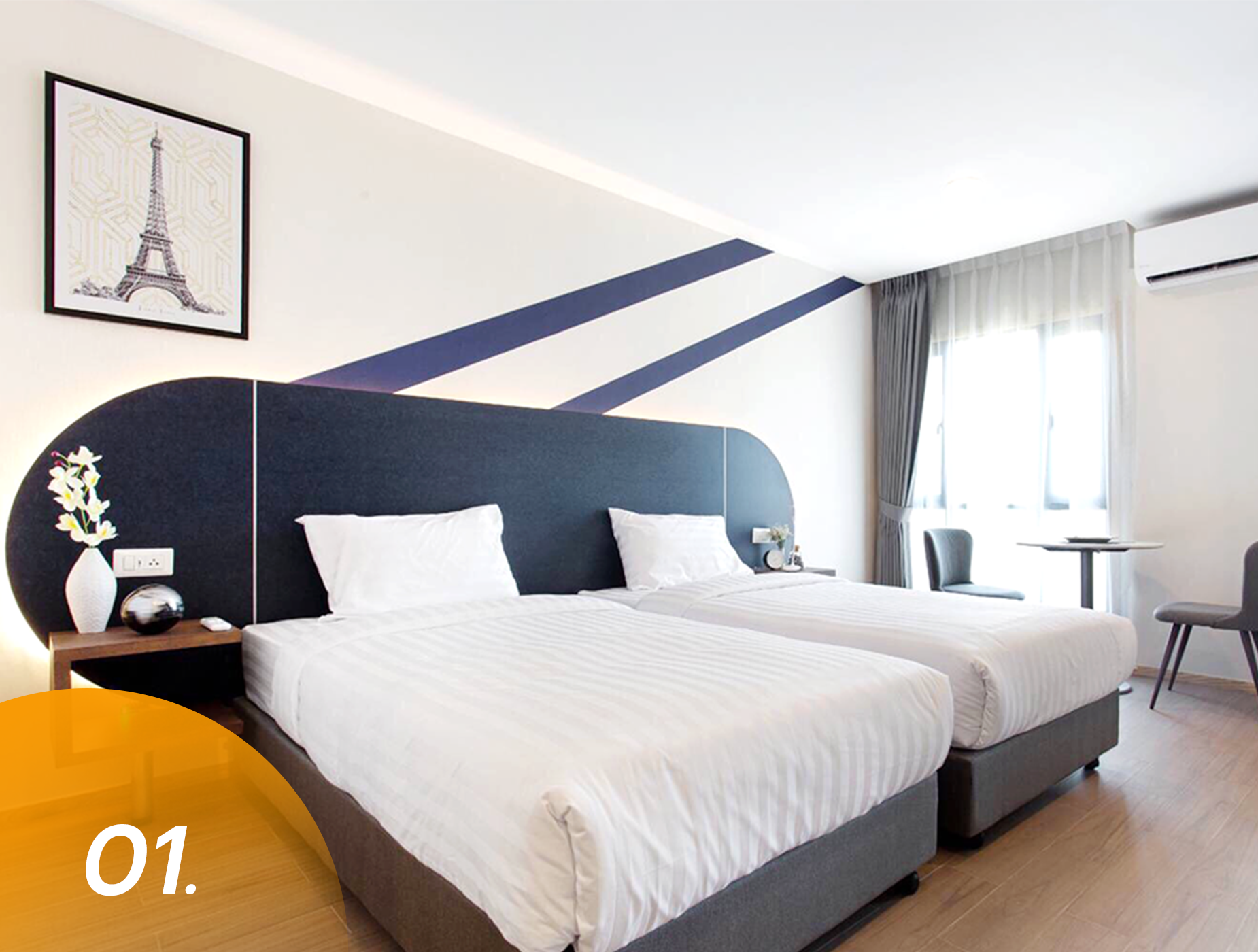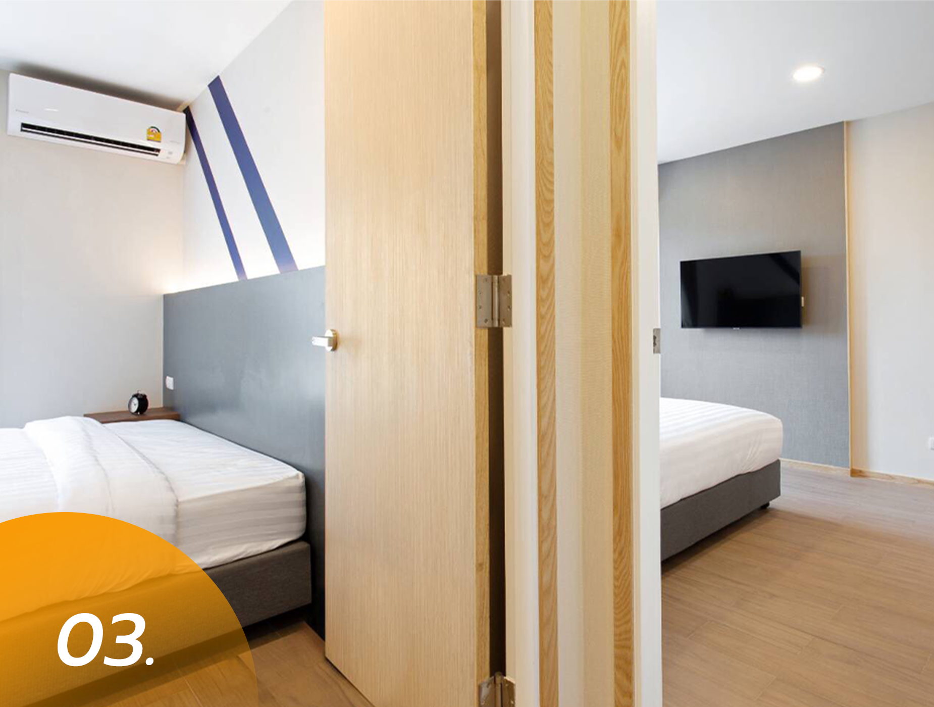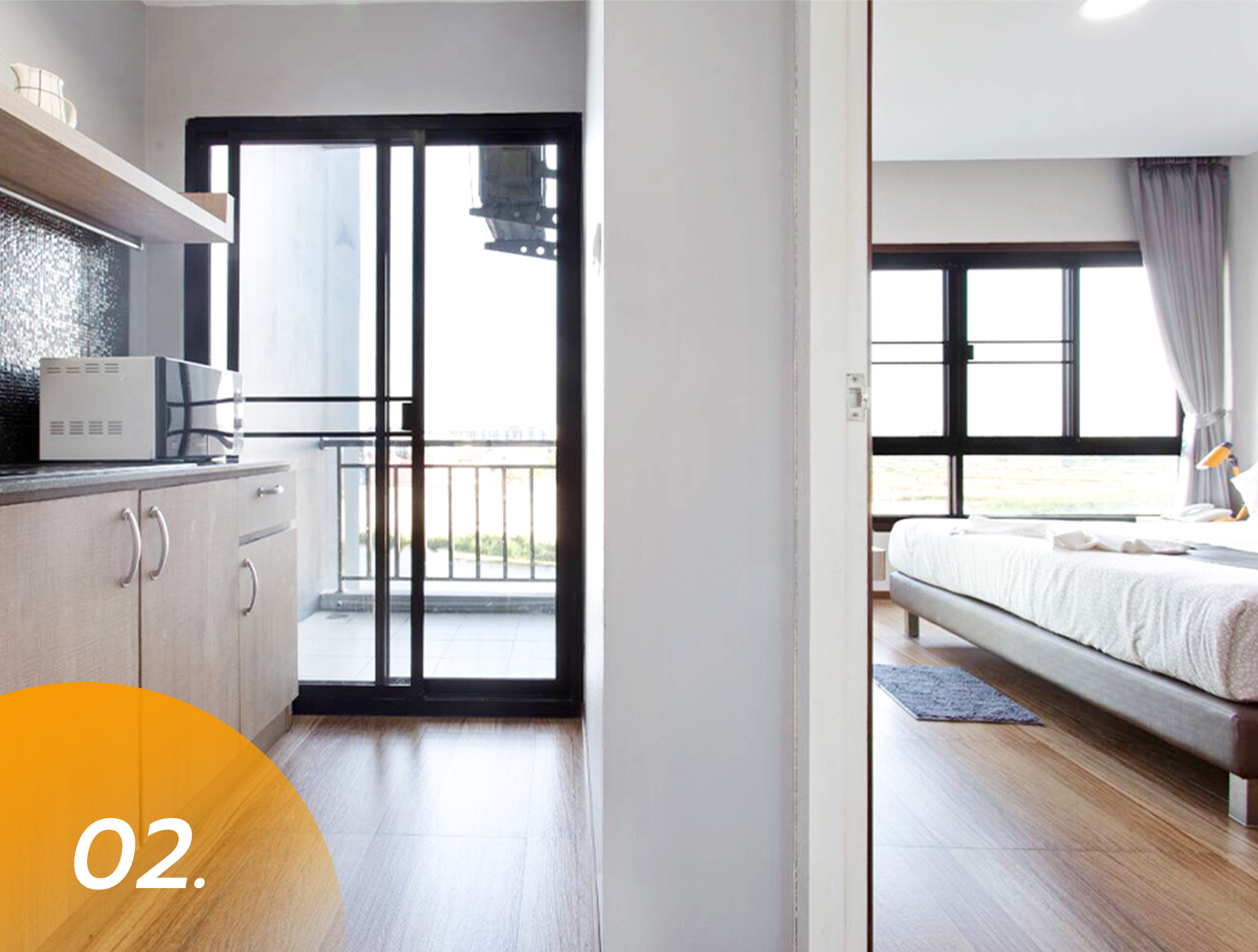 เราพิถีพิถันในการออกแบบทุกรายละเอียดให้รองรับกับการพักอาศัยที่สะดวกสบายที่สุด พื้นที่ใช้สอยในห้องหลากหลาย เป็นสัดส่วน เน้น ความสวยงาม ความเงียบสงบ และความเป็นส่วนตัว เพื่อให้คุณสามารถพักผ่อนหย่อนใจได้เป็นอย่างดี